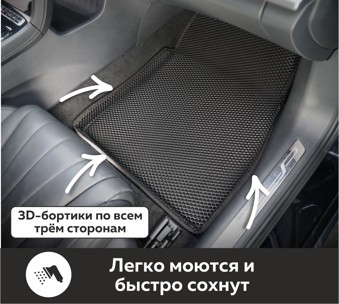 Изделия EVA имеют специальную ячеистую структуру (ячейки глубиной 8 мм), которая эффективно задерживает грязь и воду, оставляя вашу обувь и поверхность обивки салона или багажника абсолютно чистыми. Также эти ячейки очень легко и быстро очищаются без применения специальных инструментов, в том числе, при помощи бесконтактной мойки.