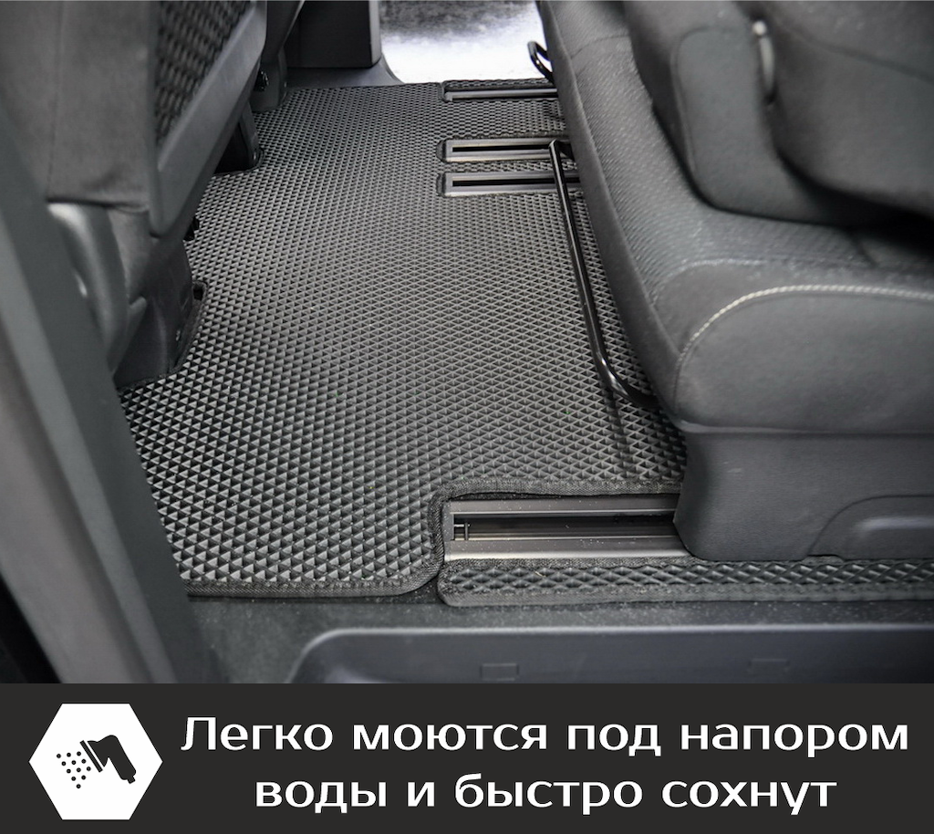 Изделия EVA имеют специальную ячеистую структуру (ячейки глубиной 8 мм), которая эффективно задерживает грязь и воду, оставляя вашу обувь и поверхность обивки салона или багажника абсолютно чистыми. Также эти ячейки очень легко и быстро очищаются без применения специальных инструментов, в том числе, при помощи бесконтактной мойки.