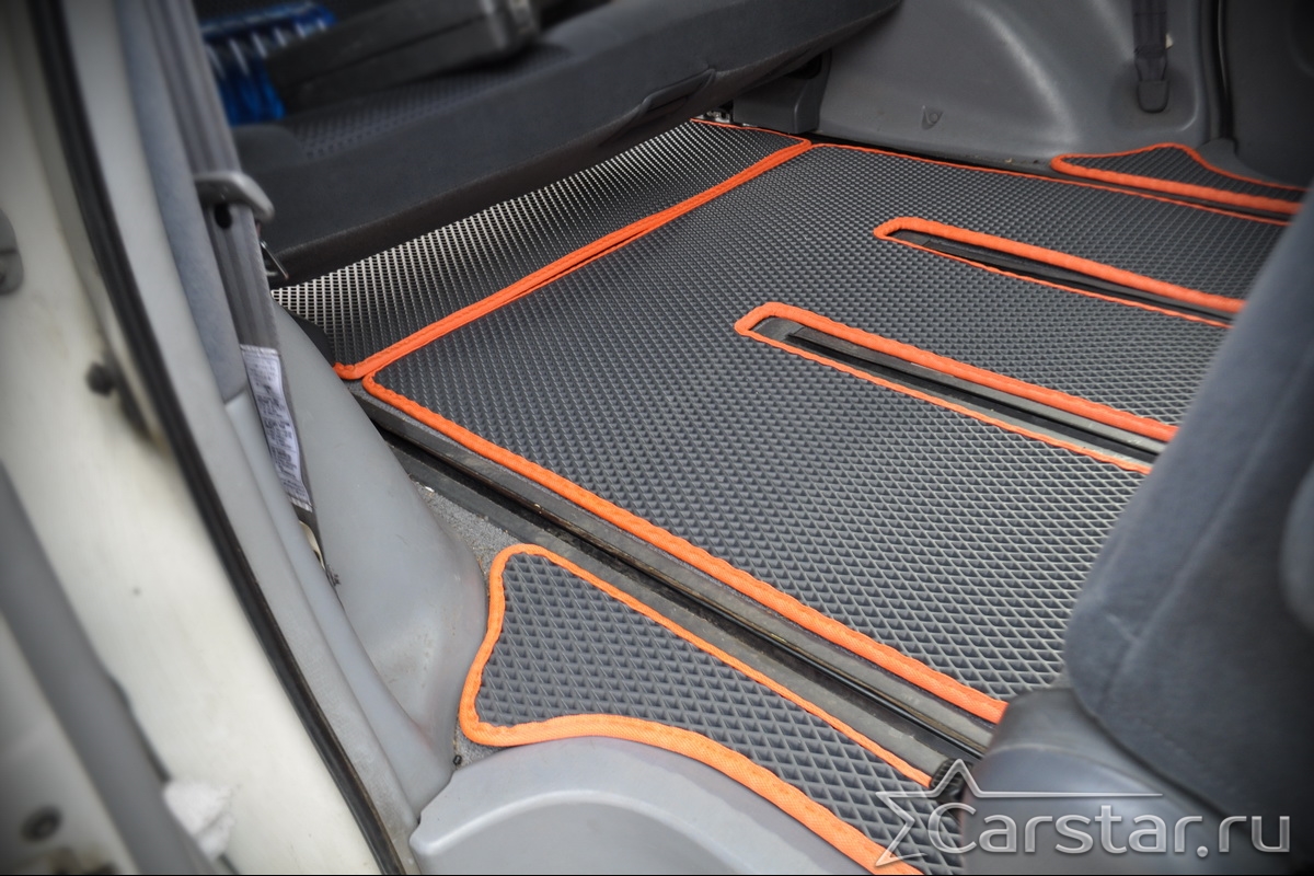 Толщина ковриков EVA составляет 10-12 мм. Глубина ячеек 7-8 мм. Такая толщина ковриков позволяет им служить довольно долго, не протираясь до 3 лет. А благодаря такой глубине ячеек коврик EVA площадью 1 кв.м. способен захватить около 3,5 л жидкости, сохраняя в чистоте вашу обувь и обивку салона.