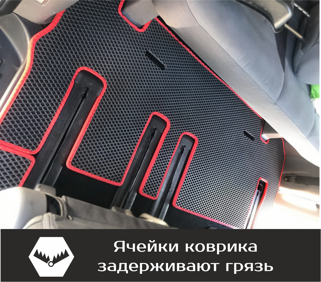 Нижняя часть ковра изготавливается из термопластичной резины с шипами 2-3 мм по всей поверхности, что предотвращает скольжение коврика по салону автомобиля.
